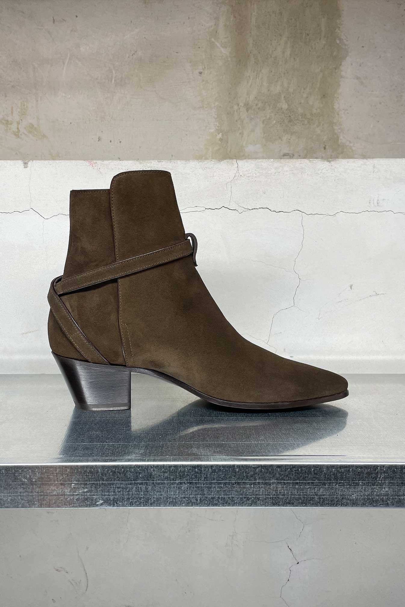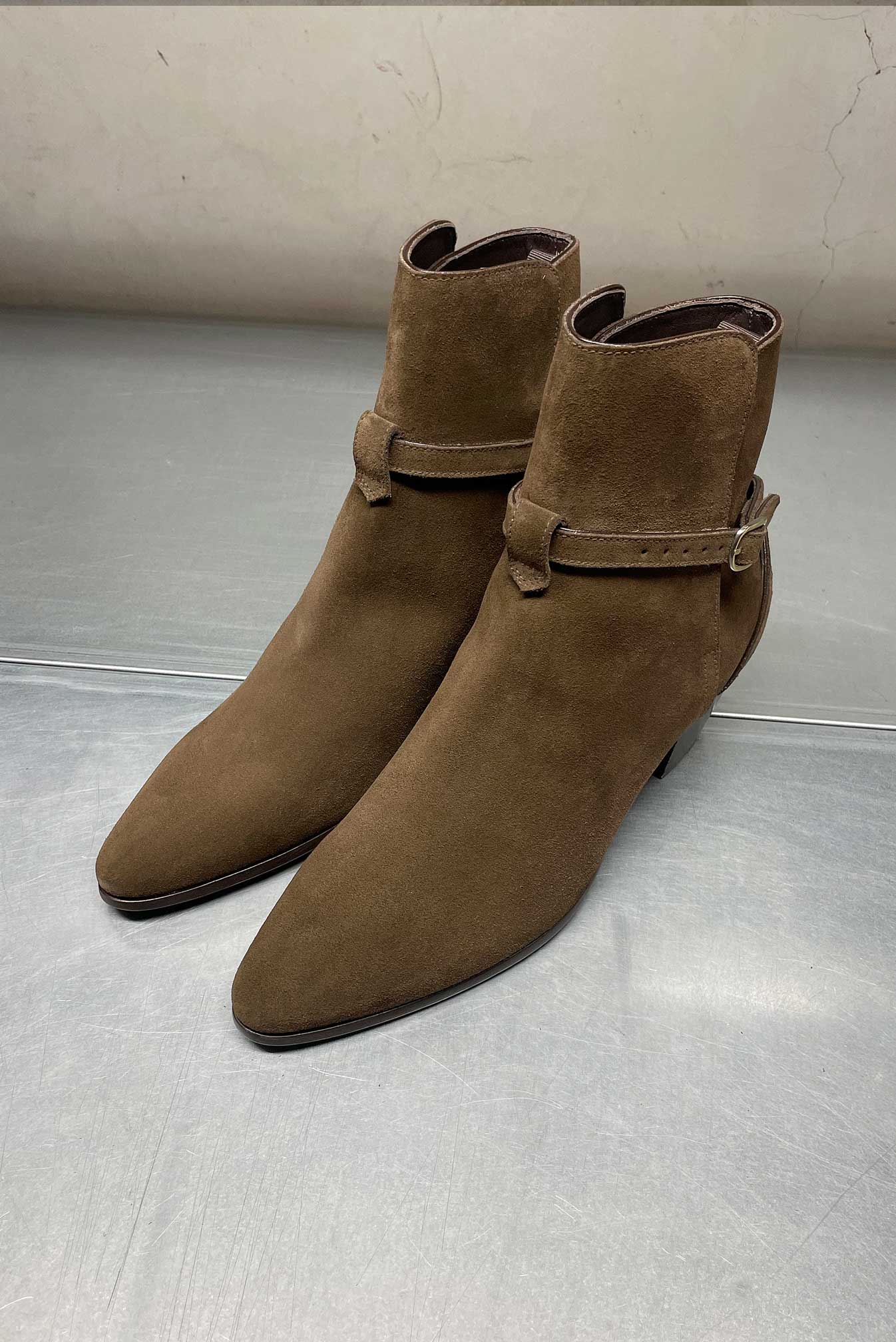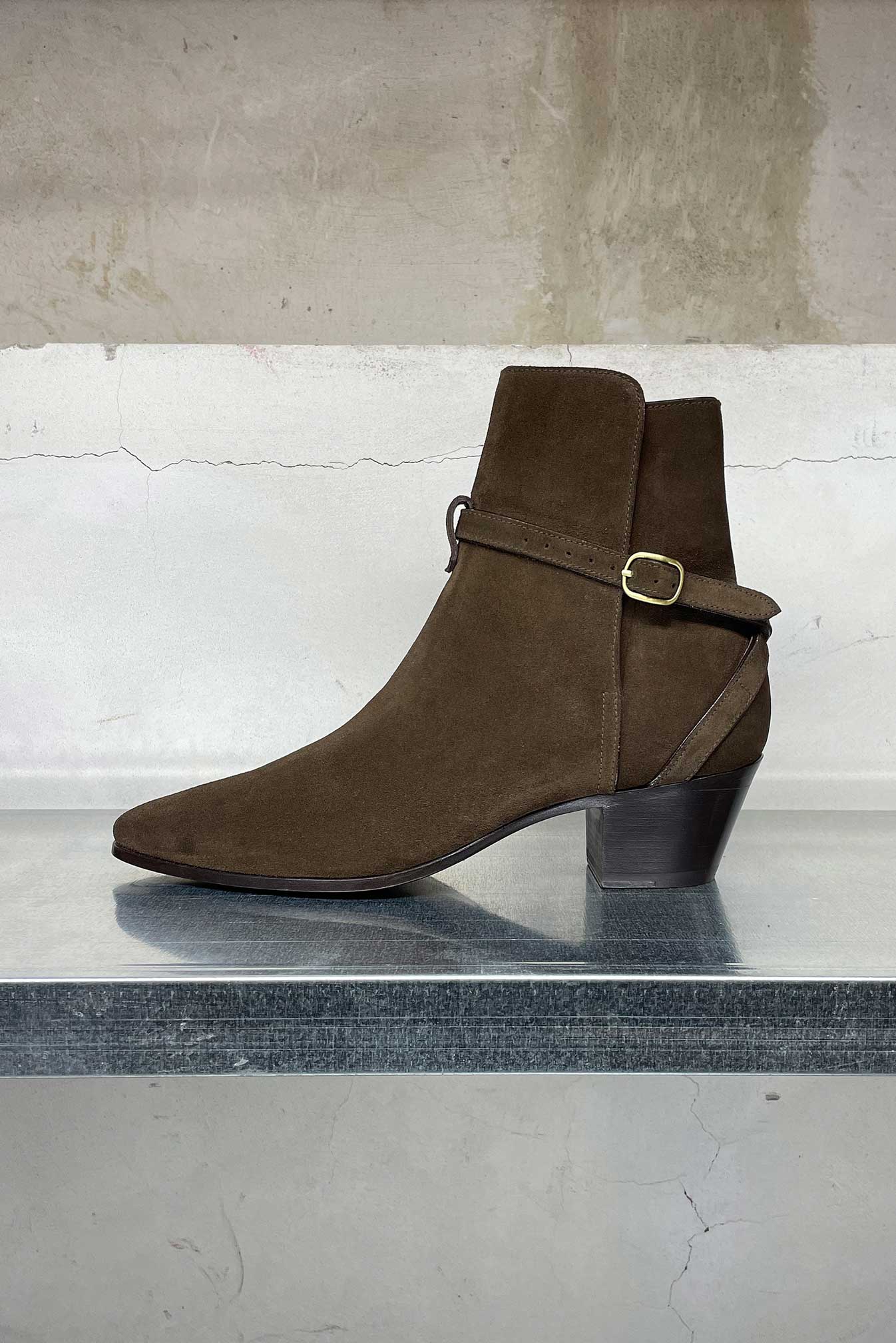 LINE 7 CONSTRUCTED CRUZ BOOT WITH BUCKLE STRAP FASTENING. BLAKE CONSTRUCTION WITH ADDED FLEXIBLITY AND CLOSE-CUT WAIST. CRAFTED IN ITALIAN CALF SUEDE FROM CONCERIA SCIARADA WITH GENEROUS HANDLE AND SILKY RICH APPEARANCE ON LAST 6-881 WITH STRAIGHT RAZOR TOE. FULLY LINED IN COWSKIN. LEATHER STACKED 60MM CUBAN HEEL WITH BRASS NAILS. VEGETABLE TANNED ITALIAN LEATHER SOLES BY CUOIO DI TOSCANA.