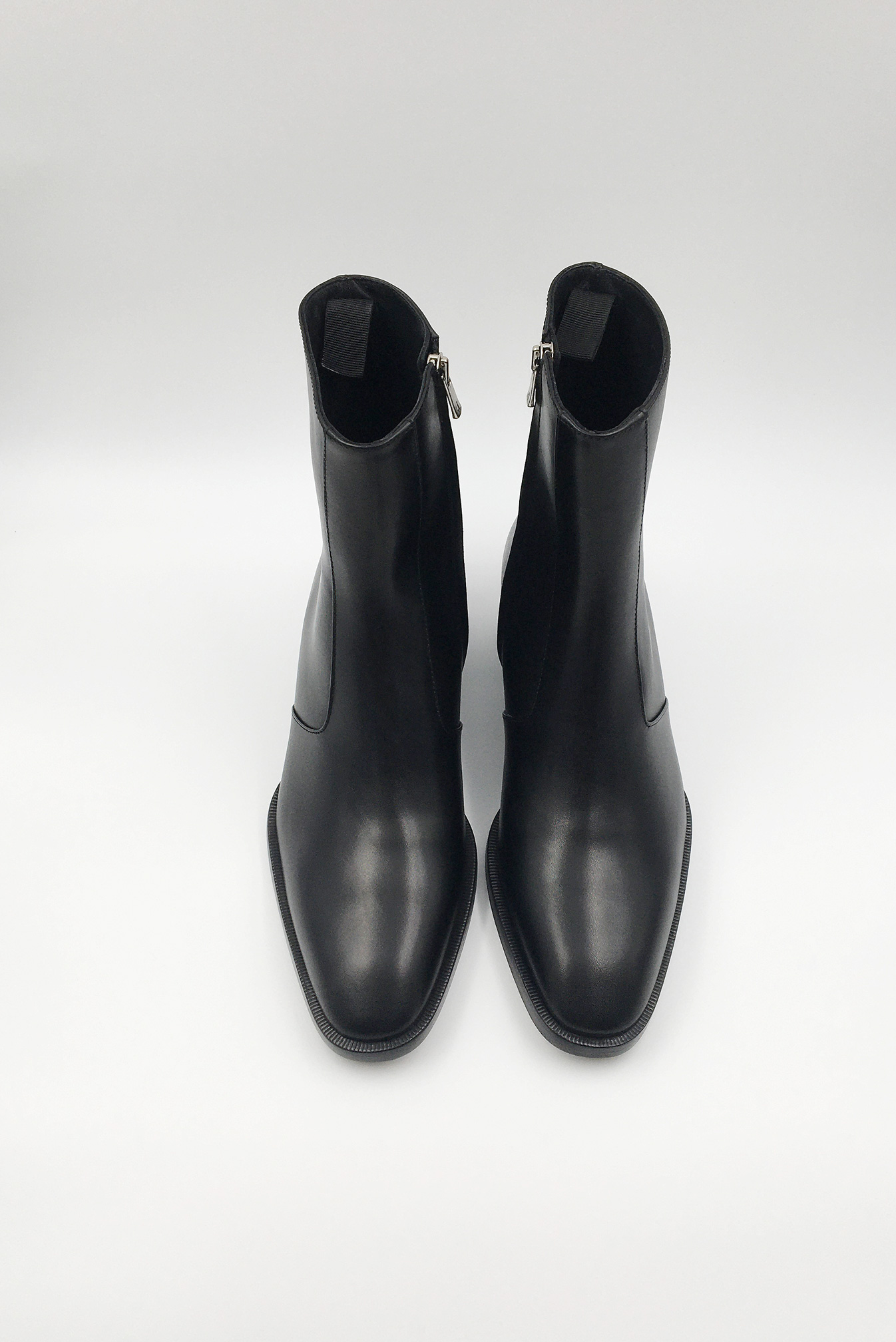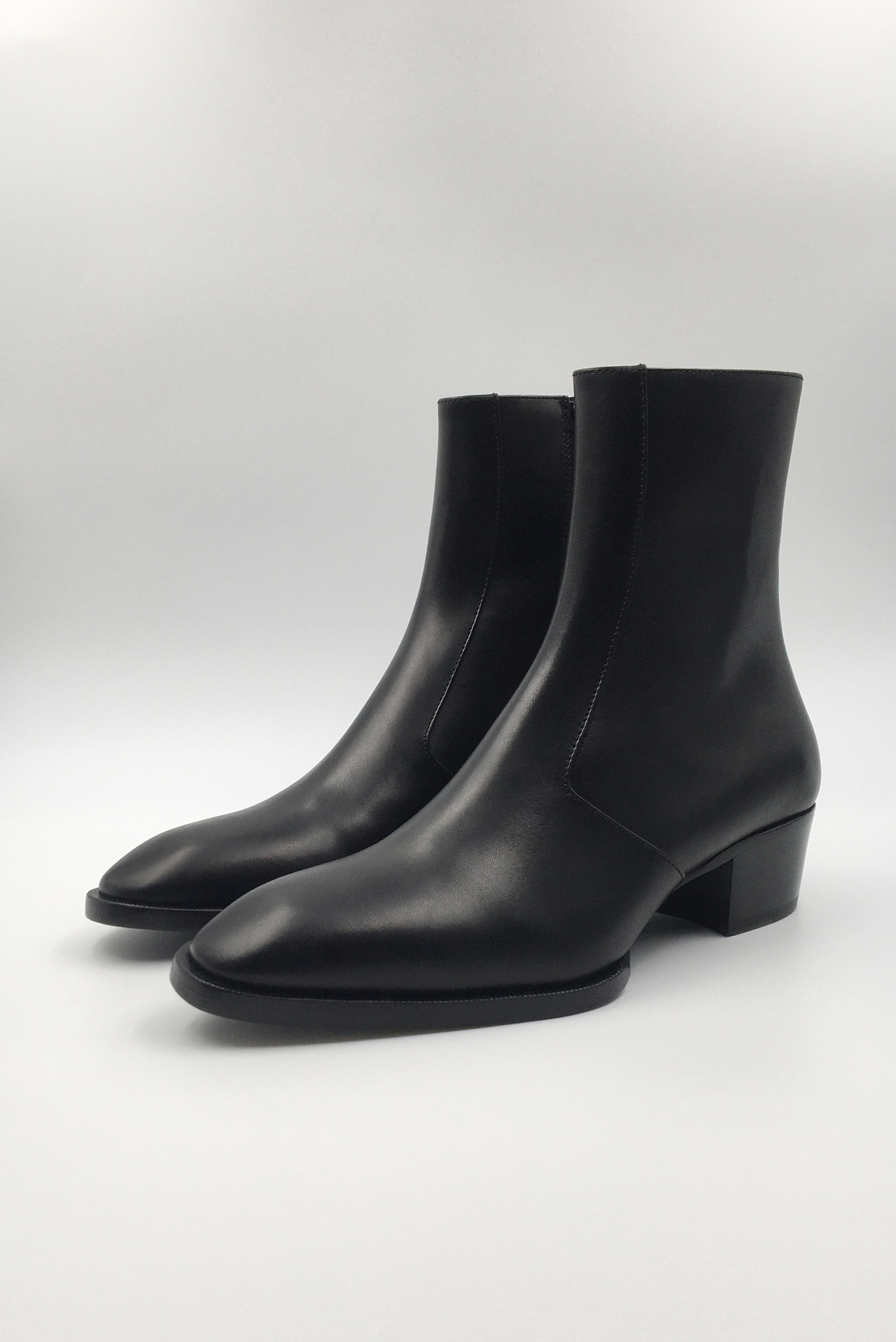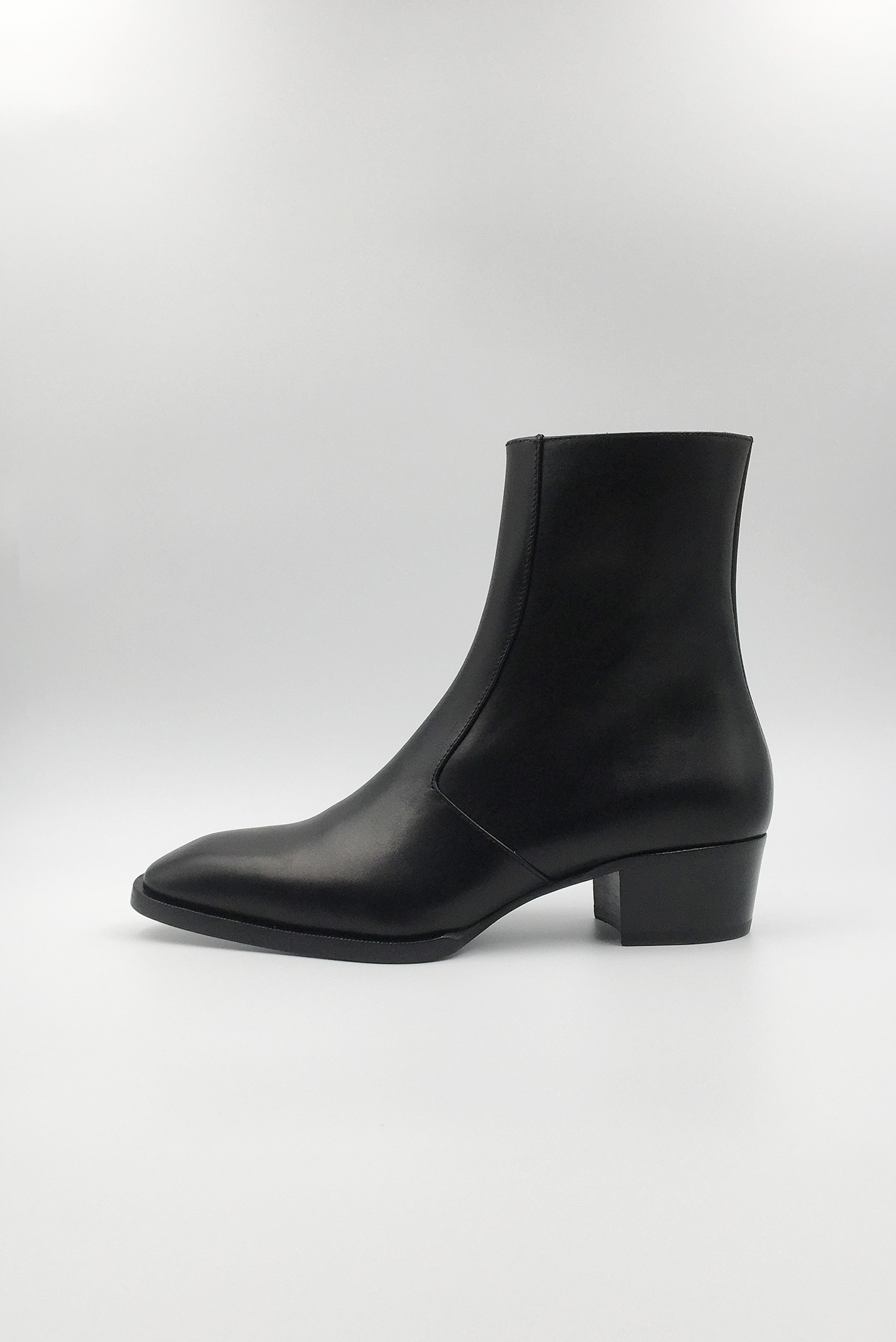 LINE 5 CONSTRUCTED LAUREN BOOT WITH CONCEALED YKK EXCELLA METAL ZIP ON THE INTERIOR. BLAKE CONSTRUCTION WITH ADDED FLEXIBLITY AND LEATHER WELT TAPERING OUT AT THE CLOSE-CUT WAIST. CRAFTED IN FRENCH CALF FROM TANNERIES D'ANNONAY WITH FULL GRAIN ANILINE FINISH ON LAST 2 WITH SOFT SQUARE TOE. FULLY LINED IN COWSKIN. LEATHER STACKED 45MM PITCHED HEEL WITH BRASS NAILS. VEGETABLE TANNED ITALIAN LEATHER SOLES BY CUOIO DI TOSCANA.